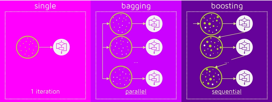 这些方法的出现,原本是为了来帮助decision tree,让一个本来variance很高,但bias比较低的进行一些转变.由于decision tree 的variance会比较大,bias小,所以可以用ensemble的方法